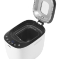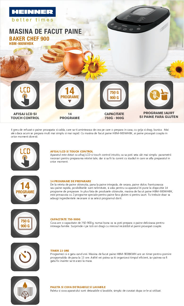 Masina de facut paine Heinner HBM-900WHBK, display LCD, capacitate: 900g, putere: 550W, butoane touch, 14 programe de preparare, timer 13h, functie mentinere cald: 60 min,3 nivele de rumenire, fereastra de supraveghere, paleta si cuva detasabile si lavabile, pahar si lingura pentru masurare