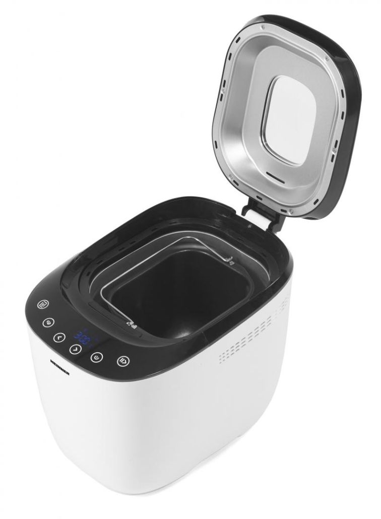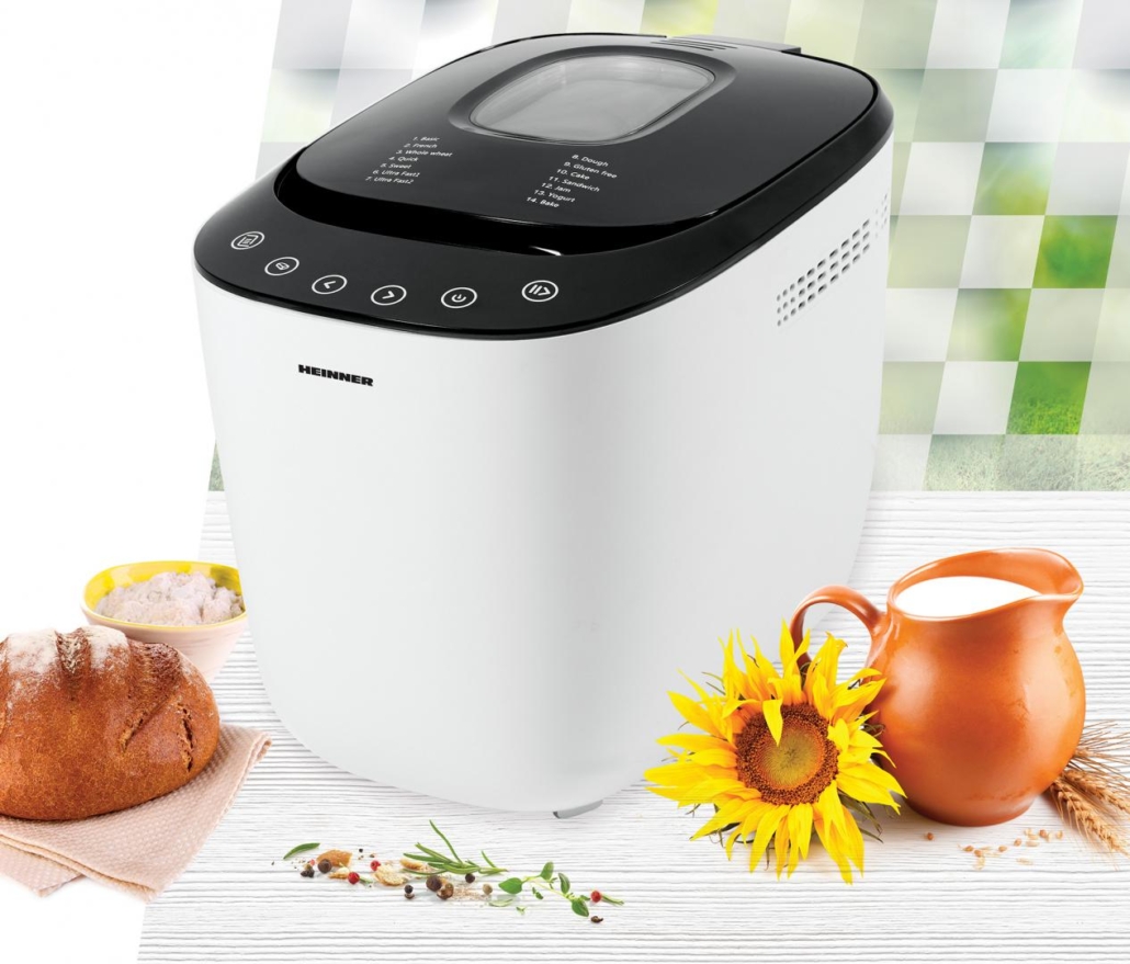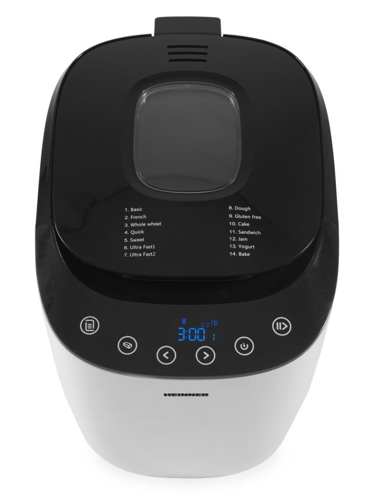 Masina de facut paine Heinner HBM-900WHBK, display LCD, capacitate: 900g, putere: 550W, butoane touch, 14 programe de preparare, timer 13h, functie mentinere cald: 60 min,3 nivele de rumenire, fereastra de supraveghere, paleta si cuva detasabile si lavabile, pahar si lingura pentru masurare