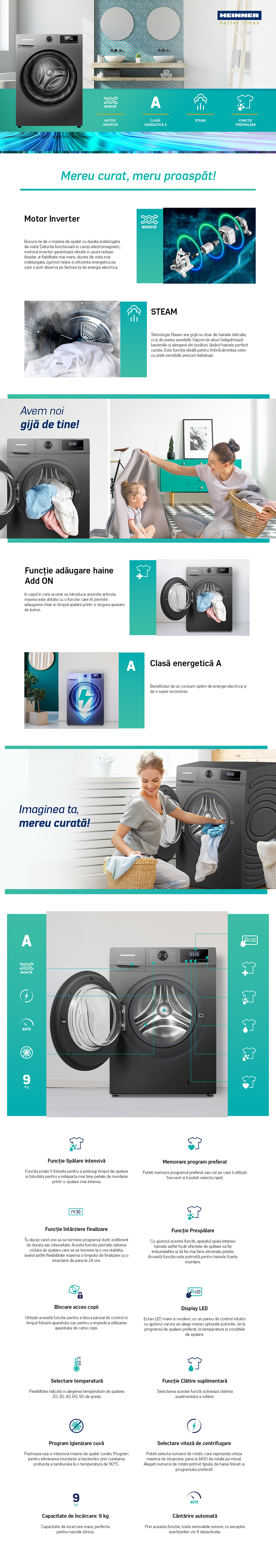 MASINA DE SPALAT RUFE HEINNER HWM-H9014INVTA+++, CAPACITATE 9KG, VITEZA DE CENTRIFUGARE 1400RPM, CLASA ENERGETICA A, MOTOR INVERTER, 15 PROGRAME, DISPLAY DIGITAL, PROGRAM RAPID 15 MIN, PROGRAM ALLERGY STEAM, PROGRAM BABY STEAM CARE, FUNCTIE INTARZIERE FINALIZARE, CLATIRE SUPLIMENTARA, PRESPALARE, FUNCTIE ADAUGARE RUFE, CANTARIRE AUTOMATA, MEMORARE PROGRAM PREFERAT, SELECTOR TEMPERATURA, SELECTOR VITEZA DE CENTRIFUGARE, BLOCARE ACCES COPII, DIMENSIUNI ( LXAXI): 60X61X85 CM, CULOARE: GRI TITANIUM