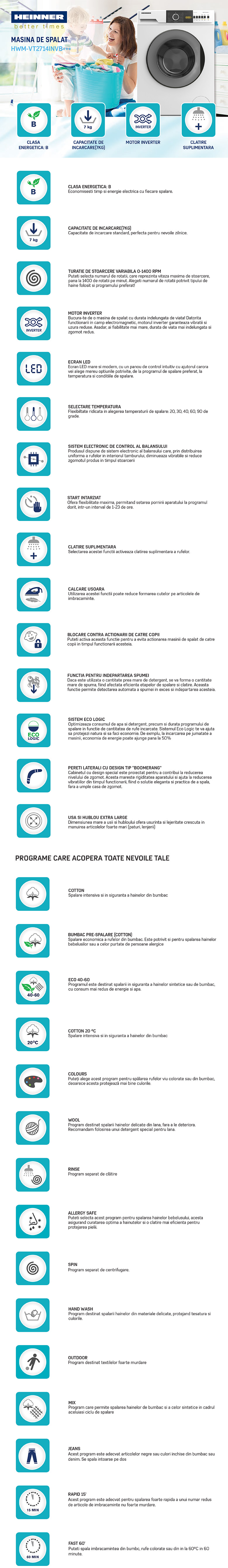 MASINA DE SPALAT RUFE HEINNER HWM-VT2714INVB+++, CAPACITATE 7KG, VITEZA DE CENTRIFUGARE 1400RPM, CLASA ENERGETICA B, MOTOR INVERTER, 15 PROGRAME, DISPLAY LED, PROGRAM RAPID 15 MIN, PROGRAM SCURT 60 MIN, PROGRAM ALLERGY SAFE, FUNCTIE START INTARZIAT, CLATIRE SUPLIMENTARA, FUNCTIE ANTI-SIFONARE, SISTEM ECO LOGIC, SISTEM DETECTARE SPUMA, SISTEM DE CONTROL ELECTRONIC AL BALANSULUI, BLOCARE ACCES COPII, DIMENSIUNI ( LXAXI): 59.7X49.7X84.5 CM, CULOARE: ALB