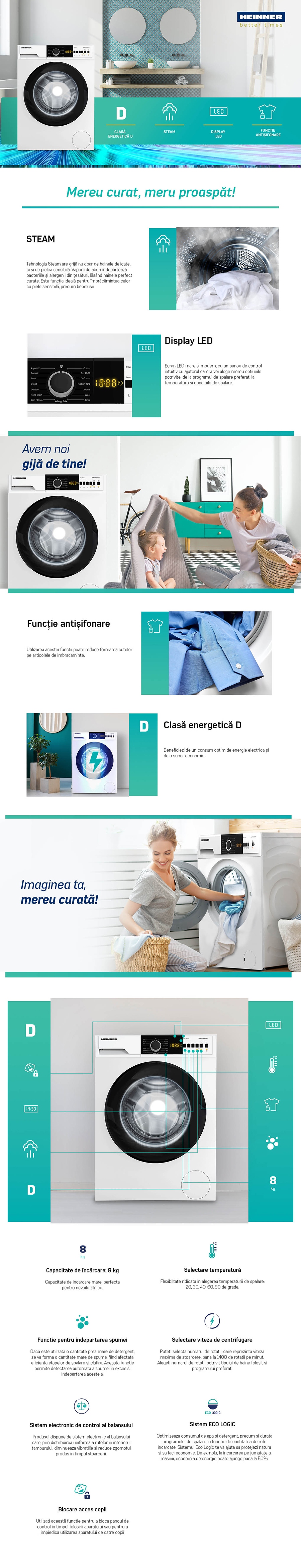 MASINA DE SPALAT RUFE HEINNER HWM-VT2814CHD+++, CAPACITATE 8KG, VITEZA DE CENTRIFUGARE 1400RPM, CLASA ENERGETICA D, 15 PROGRAME, DISPLAY DIGITAL, PROGRAM RAPID 15 MIN, PROGRAM SCURT 60 MIN, PROGRAM ALLERGY SAFE, FUNCTIE START INTARZIAT, FUNCTIE STEAM, FUNCTIE ANTI-SIFONARE, SISTEM ECO LOGIC, SISTEM DETECTARE SPUMA, SISTEM DE CONTROL ELECTRONIC AL BALANSULUI, BLOCARE ACCES COPII, DIMENSIUNI ( LXAXI): 59.7X55.7X84.5 CM, CULOARE: ALB