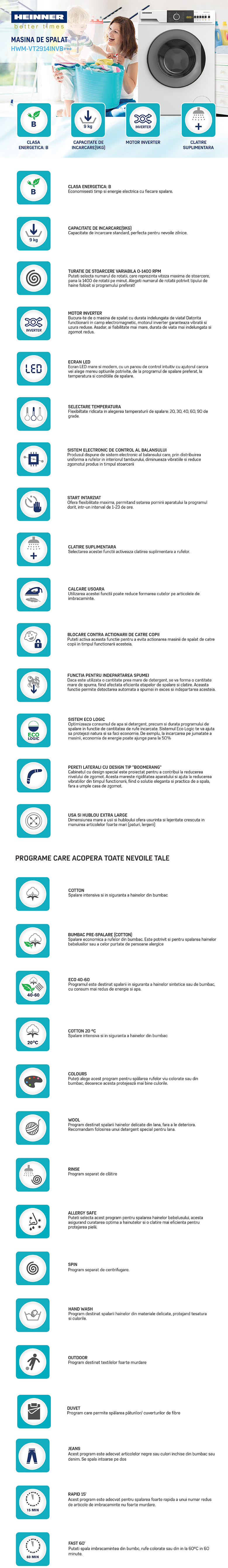 MASINA DE SPALAT RUFE HEINNER HWM-VT2914INVB+++, CAPACITATE 9KG, VITEZA DE CENTRIFUGARE 1400RPM, CLASA ENERGETICA B, MOTOR INVERTER, 15 PROGRAME, DISPLAY LED, PROGRAM RAPID 15 MIN, PROGRAM SCURT 60 MIN, PROGRAM ALLERGY SAFE, FUNCTIE START INTARZIAT, CLATIRE SUPLIMENTARA, FUNCTIE ANTI-SIFONARE, SISTEM ECO LOGIC, SISTEM DETECTARE SPUMA, SISTEM DE CONTROL ELECTRONIC AL BALANSULUI, BLOCARE ACCES COPII, DIMENSIUNI ( LXAXI): 59.7X58.2X84.5 CM, CULOARE: ALB