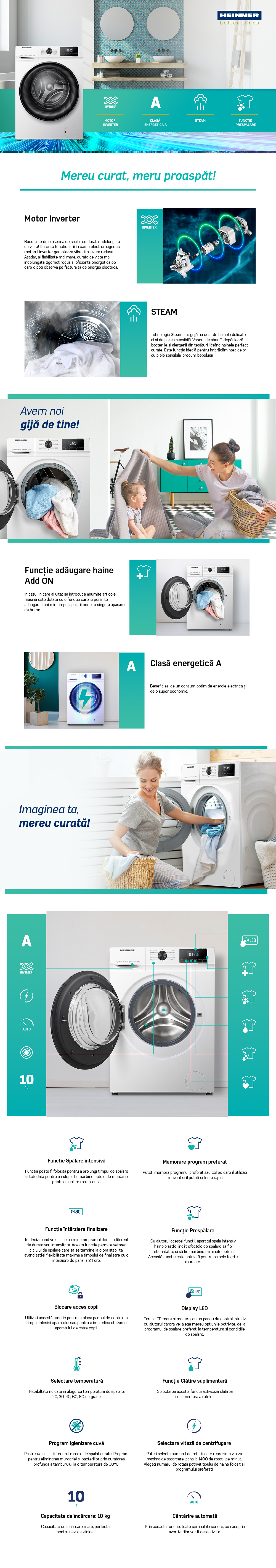 MASINA DE SPALAT RUFE HEINNER HWM-H1014INVA+++, CAPACITATE 10KG, VITEZA DE CENTRIFUGARE 1400RPM, CLASA ENERGETICA A, MOTOR INVERTER, 15 PROGRAME, DISPLAY DIGITAL, PROGRAM RAPID 15 MIN, PROGRAM ALLERGY STEAM, PROGRAM BABY STEAM CARE, FUNCTIE INTARZIERE FINALIZARE, CLATIRE SUPLIMENTARA, PRESPALARE, FUNCTIE ADAUGARE RUFE, CANTARIRE AUTOMATA, MEMORARE PROGRAM PREFERAT, SELECTOR TEMPERATURA, SELECTOR VITEZA DE CENTRIFUGARE, BLOCARE ACCES COPII, DIMENSIUNI ( LXAXI): 60X64X85 CM, CULOARE: ALB