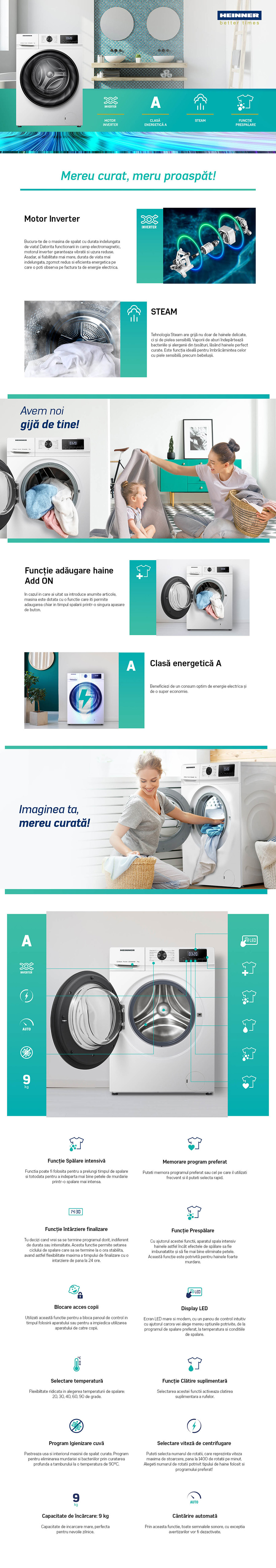 MASINA DE SPALAT RUFE HEINNER HWM-H9014INVA+++, CAPACITATE 9KG, VITEZA DE CENTRIFUGARE 1400RPM, CLASA ENERGETICA A, MOTOR INVERTER, 15 PROGRAME, DISPLAY DIGITAL, PROGRAM RAPID 15 MIN, PROGRAM ALLERGY STEAM, PROGRAM BABY STEAM CARE, FUNCTIE INTARZIERE FINALIZARE, CLATIRE SUPLIMENTARA, PRESPALARE, FUNCTIE ADAUGARE RUFE, CANTARIRE AUTOMATA, MEMORARE PROGRAM PREFERAT, SELECTOR TEMPERATURA, SELECTOR VITEZA DE CENTRIFUGARE, BLOCARE ACCES COPII, DIMENSIUNI ( LXAXI): 60X61X85 CM, CULOARE: ALB