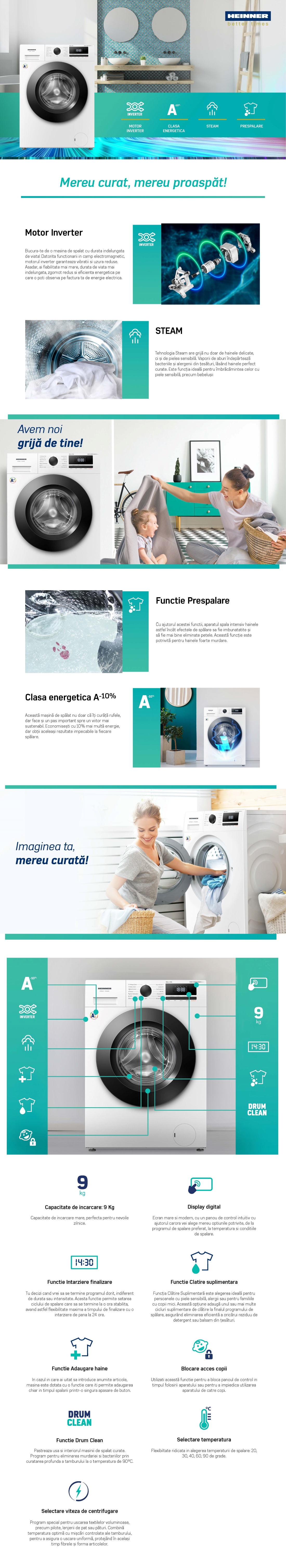 MASINA DE SPALAT RUFE HEINNER HWM-HME9014IVA10+++, CAPACITATE 9KG, VITEZA DE CENTRIFUGARE 1400RPM, CLASA ENERGETICA A-10, MOTOR INVERTER, 15 PROGRAME, DISPLAY DIGITAL, PROGRAM RAPID 15 MIN, PROGRAM ALLERGY STEAM, PROGRAM BABY STEAM CARE, FUNCTIE INTARZIERE FINALIZARE, CLATIRE SUPLIMENTARA, PRESPALARE, FUNCTIE ADAUGARE RUFE SELECTOR TEMPERATURA, SELECTOR VITEZA DE CENTRIFUGARE, BLOCARE ACCES COPII, DIMENSIUNI ( LXAXI): 59.5X58X84.5 CM, CULOARE: ALB