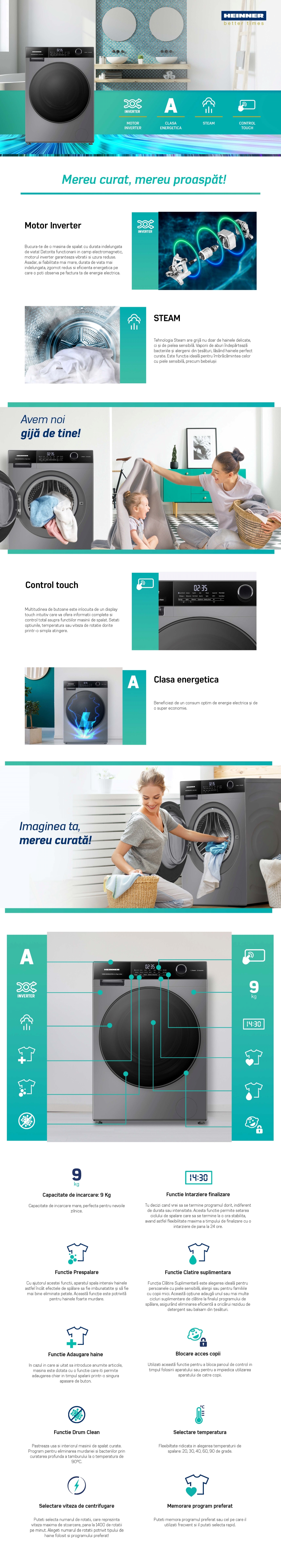 MASINA DE SPALAT RUFE HEINNER HWM-HMK9014IVTA+++, CAPACITATE 9KG, VITEZA DE CENTRIFUGARE 1400RPM, CLASA ENERGETICA A, MOTOR INVERTER, 15 PROGRAME, CONTROL TOUCH, DISPLAY DIGITAL, PROGRAM RAPID 15 MIN, PROGRAM ALLERGY STEAM, PROGRAM BABY STEAM CARE, FUNCTIE INTARZIERE FINALIZARE, CLATIRE SUPLIMENTARA, PRESPALARE, FUNCTIE ADAUGARE RUFE, CANTARIRE AUTOMATA, MEMORARE PROGRAM PREFERAT, SELECTOR TEMPERATURA, SELECTOR VITEZA DE CENTRIFUGARE, BLOCARE ACCES COPII, DIMENSIUNI ( LXAXI): 59.5X61X84.5 CM, CULOARE: GRI TITANIUM