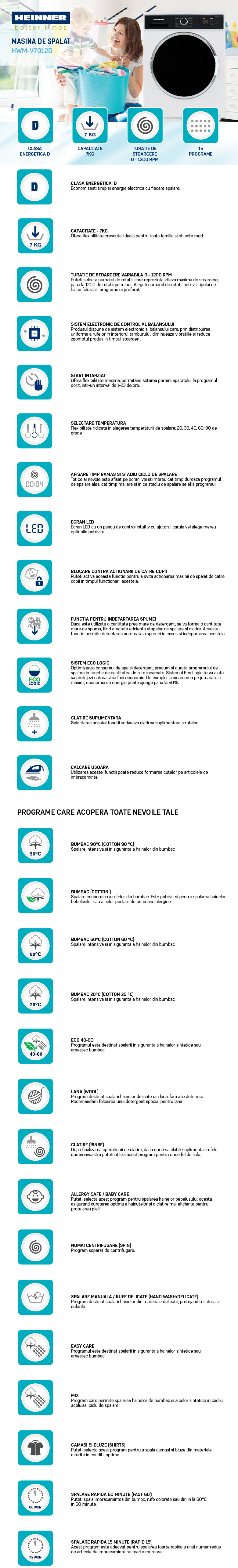 Masina de spalat rufe Heinner HWM-V7012D++, Capacitate 7kg, Viteza de centrifugare 1200rpm, Clasa energetica D, 15 programe, Display LED, Program rapid 15 min, Program scurt 60 min, Program Allergy safe, Functie Start intarziat, Functie Anti-sifonare, Sistem Eco logic, Sistem detectare spuma, Sistem de control electronic al balansului, Blocare acces copii, Dimensiuni ( LxAxI): 59.7x52.7x84.5 cm, Culoare: Alb