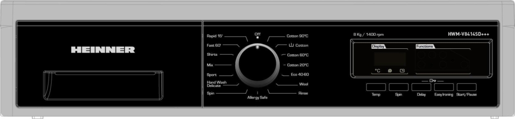 Masina de spalat rufe Heinner HWM-V8414SD+++, Capacitate 8kg, Viteza de centrifugare 1400rpm, Clasa energetica D, 15 programe, Design elegant cu panel negru si usa cromata, Display LED, Program rapid 15 min, Program scurt 60 min, Program Allergy safe, Functie Start intarziat, Functie Anti-sifonare, Sistem Eco logic, Sistem detectare spuma, Sistem de control electronic al balansului, Blocare acces copii, Dimensiuni ( LxAxI): 59.7x55.7x84.5 cm, Culoare: Argintiu