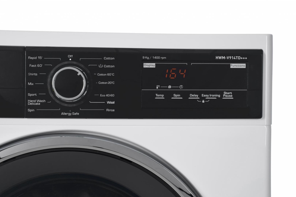 Masina de spalat rufe Heinner HWM-V914TD+++, Capacitate 9kg, Viteza de centrifugare 1400rpm, Clasa energetica D, 15 programe, Design elegant cu panel negru si usa cromata, Display LED, Control touch, Program rapid 15 min, Program scurt 60 min, Program Allergy safe, Functie Start intarziat, Functie Anti-sifonare, Sistem Eco logic, Sistem detectare spuma, Sistem de control electronic al balansului, Blocare acces copii, Dimensiuni ( LxAxI): 59.7x58.2x84.5 cm, Culoare: Alb