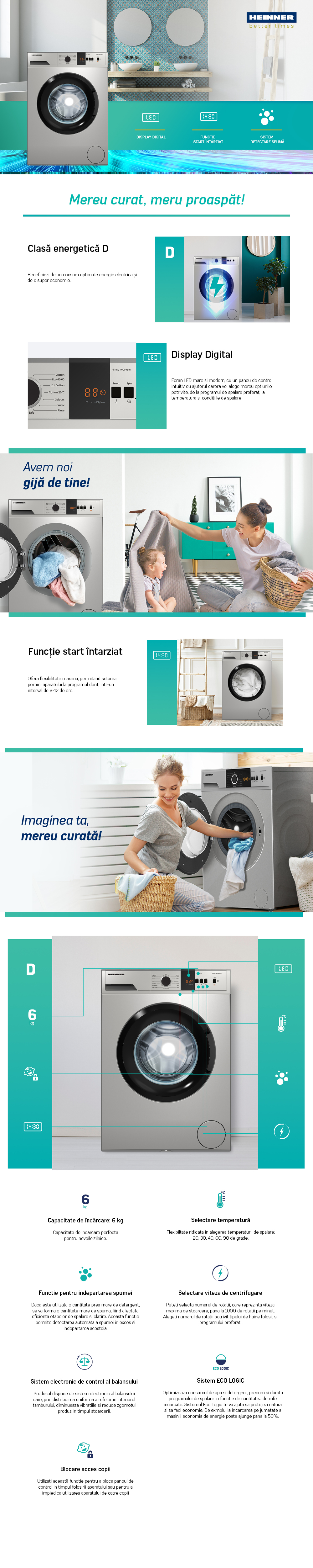 MASINA DE SPALAT RUFE HEINNER HWM-VT0610CHSD++, CAPACITATE 6KG, VITEZA DE CENTRIFUGARE 1000RPM, CLASA ENERGETICA D, 15 PROGRAME, DISPLAY DIGITAL, PROGRAM RAPID 15 MIN, PROGRAM SCURT 60 MIN, PROGRAM ALLERGY SAFE, FUNCTIE START INTARZIAT, SISTEM ECO LOGIC, SISTEM DETECTARE SPUMA, SISTEM DE CONTROL ELECTRONIC AL BALANSULUI, BLOCARE ACCES COPII, DIMENSIUNI ( LXAXI): 59.7X49.7X84.5 CM, CULOARE: SILVER