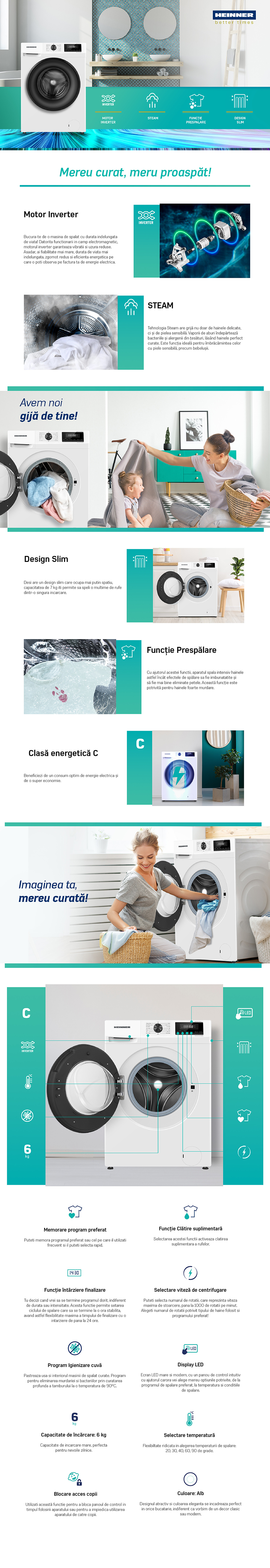 MASINA DE SPALAT RUFE SLIM HEINNER HWM-H6010IVSMC+++, CAPACITATE 6KG, VITEZA DE CENTRIFUGARE 1000RPM, CLASA ENERGETICA C, MOTOR INVERTER, 15 PROGRAME, DISPLAY DIGITAL, PROGRAM RAPID 15 MIN, PROGRAM ALLERGY STEAM, PROGRAM BABY STEAM CARE, FUNCTIE INTARZIERE FINALIZARE, CLATIRE SUPLIMENTARA, PRESPALARE, SPALARE INTENSIVA, CANTARIRE AUTOMATA, MEMORARE PROGRAM PREFERAT, SELECTOR TEMPERATURA, SELECTOR VITEZA DE CENTRIFUGARE, BLOCARE ACCES COPII, DIMENSIUNI ( LXAXI): 59.5X46.5X84.5 CM, CULOARE: ALB