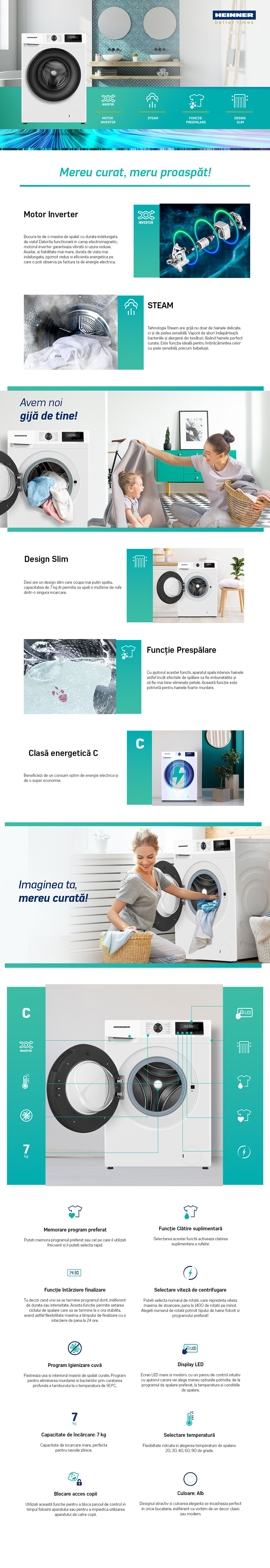 MASINA DE SPALAT RUFE SLIM HEINNER HWM-H7014IVSMC+++, CAPACITATE 7KG, VITEZA DE CENTRIFUGARE 1400RPM, CLASA ENERGETICA C, MOTOR INVERTER, 15 PROGRAME, DISPLAY DIGITAL, PROGRAM RAPID 15 MIN, PROGRAM ALLERGY STEAM, PROGRAM BABY STEAM CARE, FUNCTIE INTARZIERE FINALIZARE, CLATIRE SUPLIMENTARA, PRESPALARE, SPALARE INTENSIVA, CANTARIRE AUTOMATA, MEMORARE PROGRAM PREFERAT, SELECTOR TEMPERATURA, SELECTOR VITEZA DE CENTRIFUGARE, BLOCARE ACCES COPII, DIMENSIUNI ( LXAXI): 59.5X46.5X84.5 CM, CULOARE: ALB