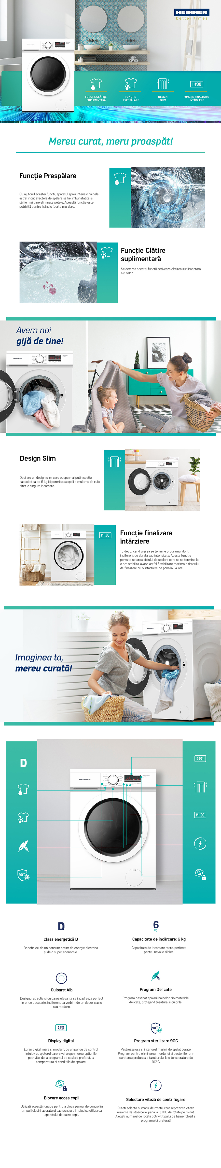 MASINA DE SPALAT RUFE SLIM HEINNER HWM-M6010SMD++, CAPACITATE 6KG, VITEZA DE CENTRIFUGARE 1000RPM, CLASA ENERGETICA D, 15 PROGRAME, DISPLAY DIGITAL, PROGRAM RAPID 15 MIN, PROGRAM HYGIENE 90°C, PROGRAM DELICATE, CLATIRE SUPLIMENTARA, PRESPALARE, FUNCTIE INTARZIERE FINALIZARE, SELECTOR VITEZA DE CENTRIFUGARE, BLOCARE ACCES COPII, DIMENSIUNI ( LXAXI): 59.5X40X85 CM, CULOARE: ALB