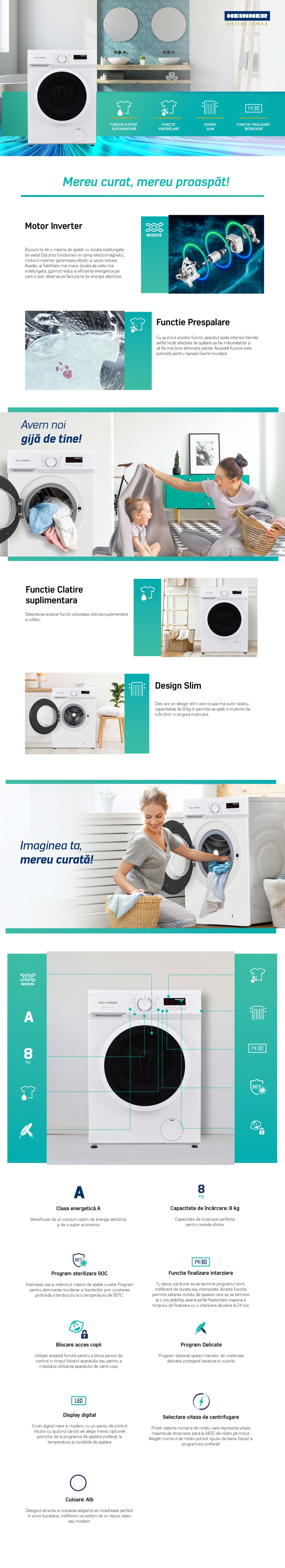 MASINA DE SPALAT RUFE SLIM HEINNER HWM-M8014SMA+++, CAPACITATE 8KG, VITEZA DE CENTRIFUGARE 1400RPM, CLASA ENERGETICA A, MOTOR INVERTER, 15 PROGRAME, DISPLAY DIGITAL, PROGRAM RAPID 15 MIN, PROGRAM HYGIENE 90°C, PROGRAM DELICATE, CLATIRE SUPLIMENTARA, PRESPALARE, FUNCTIE INTARZIERE FINALIZARE, SELECTOR TEMPERATURA, SELECTOR VITEZA DE CENTRIFUGARE, BLOCARE ACCES COPII, DIMENSIUNI ( LXAXI): 59.5X47.5X85 CM, CULOARE: ALB