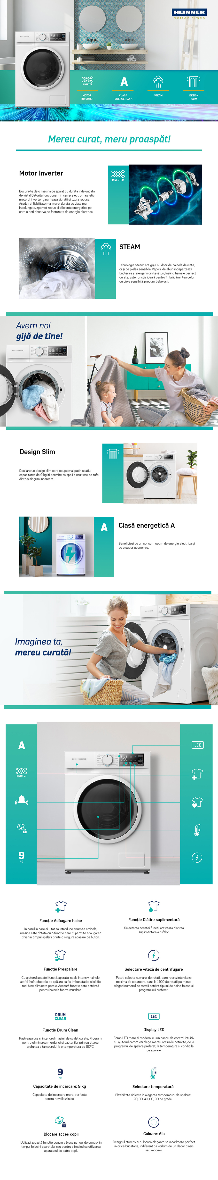 MASINA DE SPALAT RUFE SLIM HEINNER HWM-M914IVNA+++, CAPACITATE 9KG, VITEZA DE CENTRIFUGARE 1400RPM, CLASA ENERGETICA A, MOTOR INVERTER, 15 PROGRAME, DISPLAY DIGITAL, PROGRAM RAPID 15 MIN, PROGRAM STEAM, PROGRAM BABY CARE, CLATIRE SUPLIMENTARA, PRESPALARE, FUNCTIE INTARZIERE FINALIZARE, FUNCTIE IGIENIZARE CUVA, FUNCTIE ADAUGARE RUFE, SELECTOR TEMPERATURA, SELECTOR VITEZA DE CENTRIFUGARE, BLOCARE ACCES COPII, DIMENSIUNI ( LXAXI): 59.5X49.5X85 CM, CULOARE: ALB