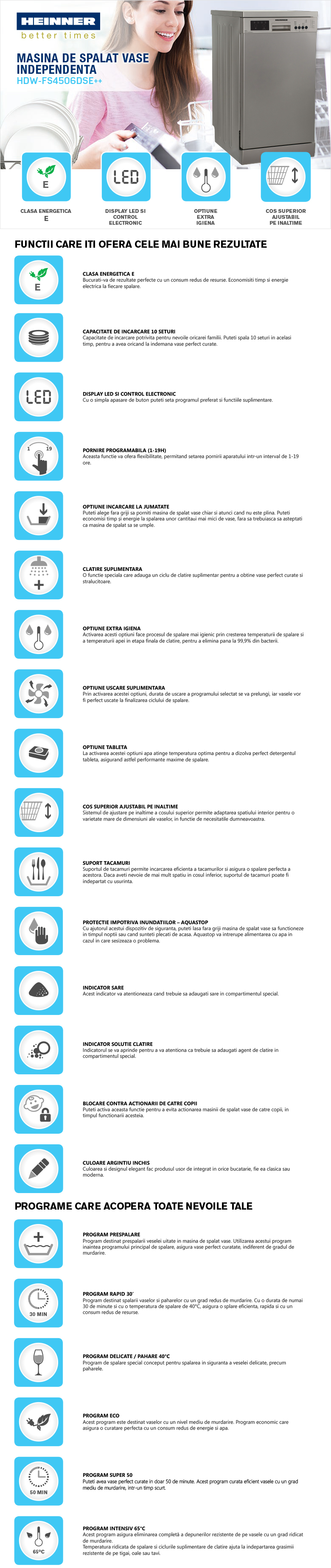 Masina de spalat vase Heinner HDW-FS4506DSE++, 10 seturi, clasa energetica E, control electronic, display LED, 6 programe de spalare, program rapid 30’, program Pahare/Delicate, program Prespalare, program ECO, optiune incarcare la jumatate, pornire programabila (1-19H), clatire suplimentara, optiune Extra igiena, optiune Uscare suplimentara, optiune Tableta, blocare acces copii, cos superior ajustabil pe inaltime (gol, protectie impotriva inundatiilor - Aquastop, consum apa: 11L/ciclu de spalare, culoare: Dark Silver, dimensiuni (IxLxA): 85 x 44.8 x 59.8 cm