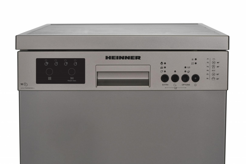 Masina de spalat vase Heinner HDW-FS4506DSE++, 10 seturi, clasa energetica E, control electronic, display LED, 6 programe de spalare, program rapid 30’, program Pahare/Delicate, program Prespalare, program ECO, optiune incarcare la jumatate, pornire programabila (1-19H), clatire suplimentara, optiune Extra igiena, optiune Uscare suplimentara, optiune Tableta, blocare acces copii, cos superior ajustabil pe inaltime (gol, protectie impotriva inundatiilor - Aquastop, consum apa: 11L/ciclu de spalare, culoare: Dark Silver, dimensiuni (IxLxA): 85 x 44.8 x 59.8 cm