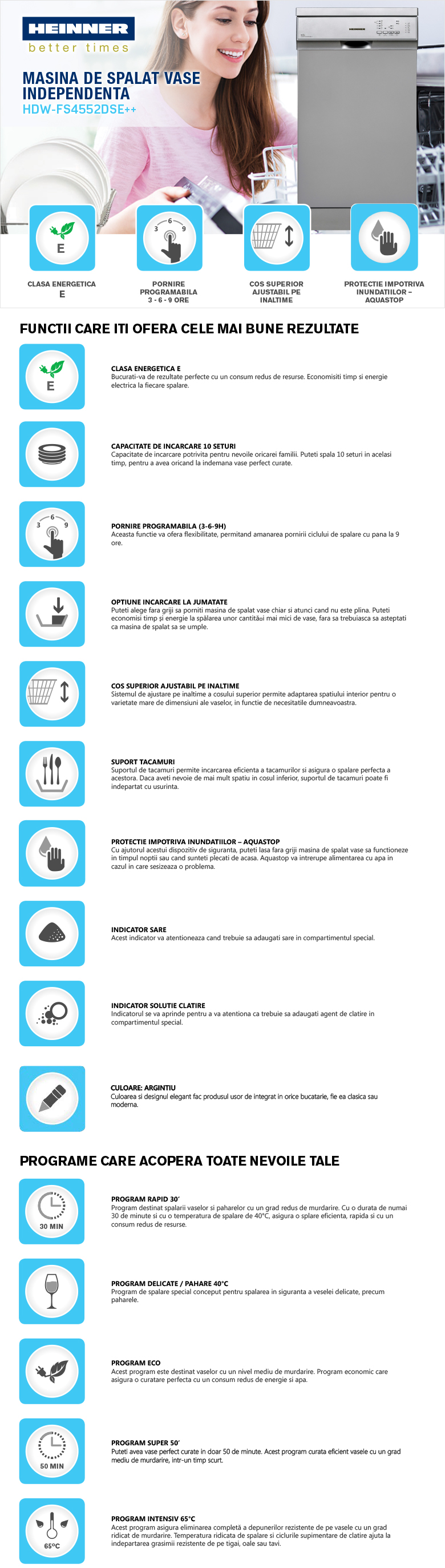 Masina de spalat vase Heinner HDW-FS4552DSE++, clasa energetica E, 10 seturi, control electronic, 5 programe de spalare, program Rapid 30’, program Pahare/Delicate, program Intensiv, program ECO, optiune incarcare la jumatate, pornire programabila (3-6-9H), cos superior ajustabil pe inaltime (gol), protectie impotriva inundatiilor - Aquastop, consum apa: 11L/ciclu de spalare, dimensiuni (WxDxH): 44.8 x 59.8 x 85 cm, culoare: argintiu