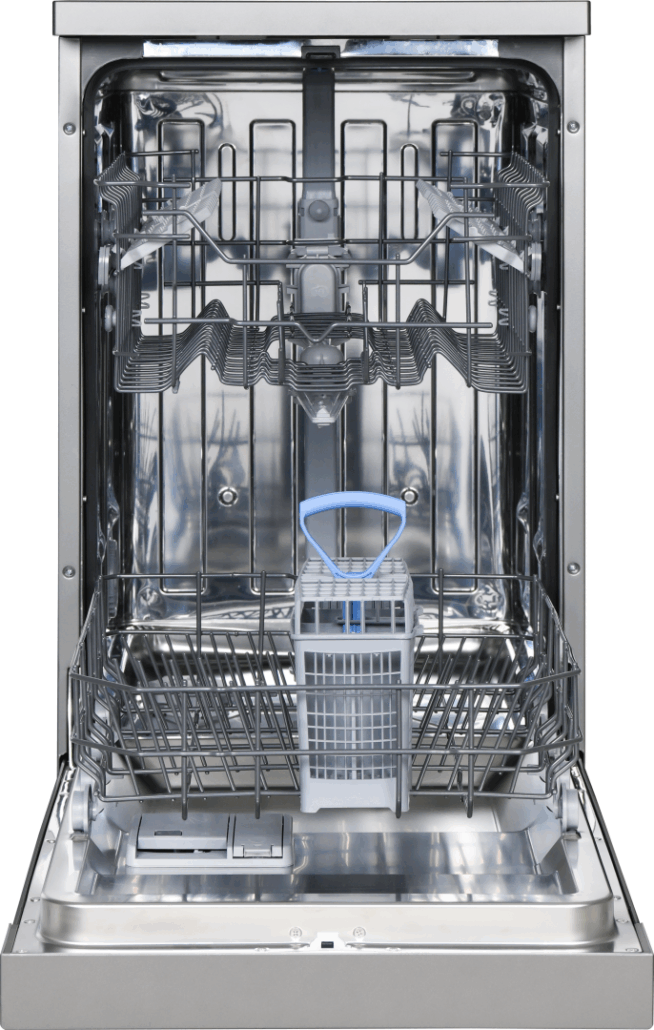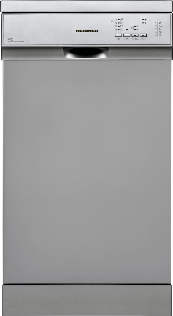 Masina de spalat vase Heinner HDW-FS4552DSE++, clasa energetica E, 10 seturi, control electronic, 5 programe de spalare, program Rapid 30’, program Pahare/Delicate, program Intensiv, program ECO, optiune incarcare la jumatate, pornire programabila (3-6-9H), cos superior ajustabil pe inaltime (gol), protectie impotriva inundatiilor - Aquastop, consum apa: 11L/ciclu de spalare, dimensiuni (WxDxH): 44.8 x 59.8 x 85 cm, culoare: argintiu