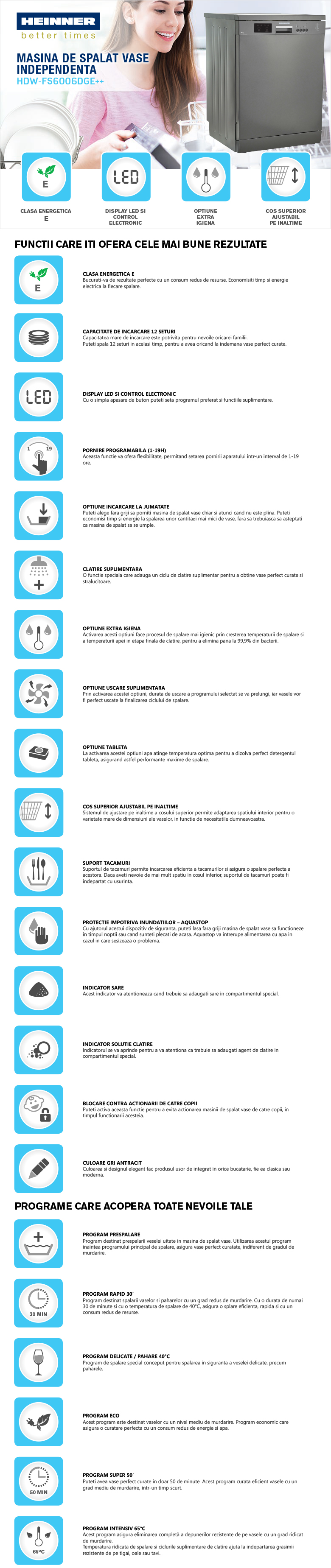Masina de spalat vase Heinner HDW-FS6006DGE++, 12 seturi, clasa energetica E, control electronic, display LED, 6 programe de spalare, program rapid 30’, program Pahare/Delicate, program ECO, optiune incarcare la jumatate, pornire programabila (1-19H), clatire suplimentara, optiune Extra igiena, optiune Uscare suplimentara, optiune Tableta, blocare acces copii, cos superior ajustabil pe inaltime (cand este gol), protectie impotriva inundatiilor – Aquastop, consum apa: 12L/ciclu de spalare, culoare: Dark Grey, dimensiuni (IxLxA): 85 x 59.8 x 59.8 cm