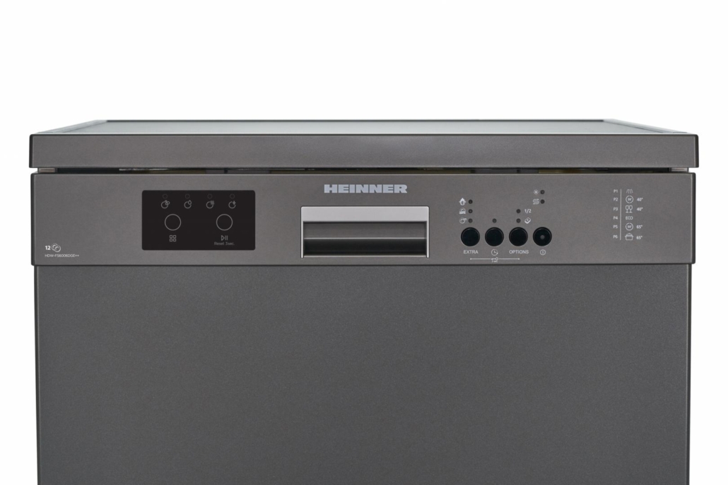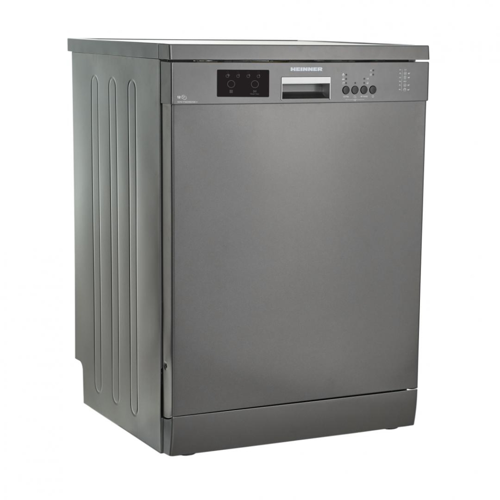 Masina de spalat vase Heinner HDW-FS6006DGE++, 12 seturi, clasa energetica E, control electronic, display LED, 6 programe de spalare, program rapid 30’, program Pahare/Delicate, program ECO, optiune incarcare la jumatate, pornire programabila (1-19H), clatire suplimentara, optiune Extra igiena, optiune Uscare suplimentara, optiune Tableta, blocare acces copii, cos superior ajustabil pe inaltime (cand este gol), protectie impotriva inundatiilor – Aquastop, consum apa: 12L/ciclu de spalare, culoare: Dark Grey, dimensiuni (IxLxA): 85 x 59.8 x 59.8 cm