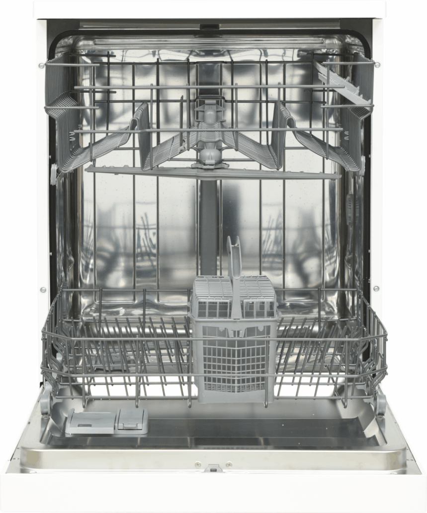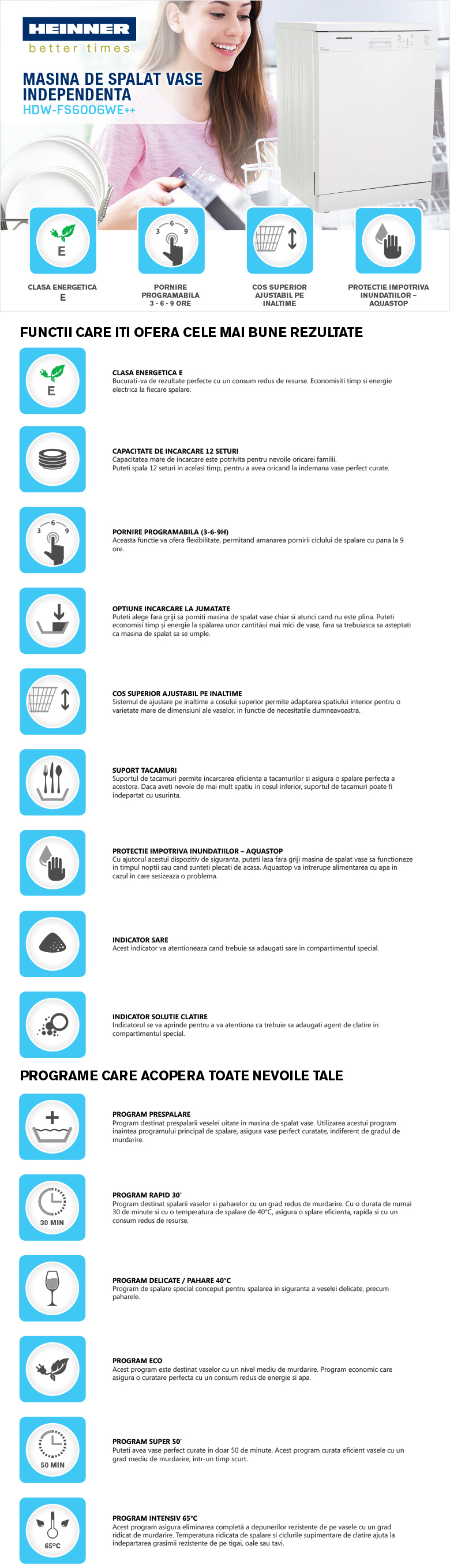 Masina de spalat vase Heinner HDW-FS6006WE++, 12 seturi ,clasa energetica E, control electronic, 6 programe de spalare, program rapid 30’, program Pahare/Delicate, program ECO, program Prespalare, optiune incarcare la jumatate, pornire programabila (3-6-9H), cos superior ajustabil pe inaltime (gol), protectie impotriva inundatiilor – Aquastop, consum apa: 12L/ciclu de spalare, dimensiuni (IxLxA): 85 x 59.8 x 59.8 cm