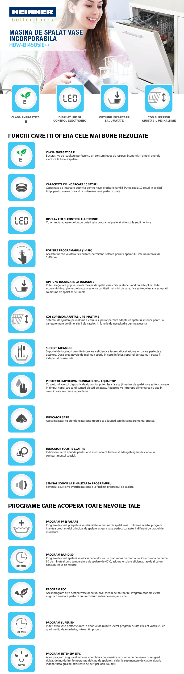 Masina de spalat vase incorporabila Heinner HDW-BI4505IE++, 10 seturi, clasa energetica E, control electronic, display LED, 5 programe de spalare, program rapid 30’, program intensiv, program ECO, optiune incarcare la jumatate, pornire programabila (1-19H), cos superior ajustabil pe inaltime (gol), protectie impotriva inundatiilor – Aquastop, semnal sonor finalizare program, consum apa: 11L/ciclu de spalare, dimensiuni: 82 x 44.8 x 55 cm