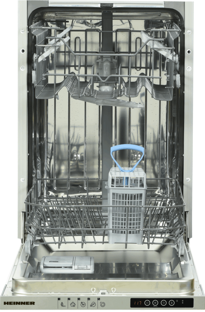 Masina de spalat vase incorporabila Heinner HDW-BI4505IE++, 10 seturi, clasa energetica E, control electronic, display LED, 5 programe de spalare, program rapid 30’, program intensiv, program ECO, optiune incarcare la jumatate, pornire programabila (1-19H), cos superior ajustabil pe inaltime (gol), protectie impotriva inundatiilor – Aquastop, semnal sonor finalizare program, consum apa: 11L/ciclu de spalare, dimensiuni: 82 x 44.8 x 55 cm