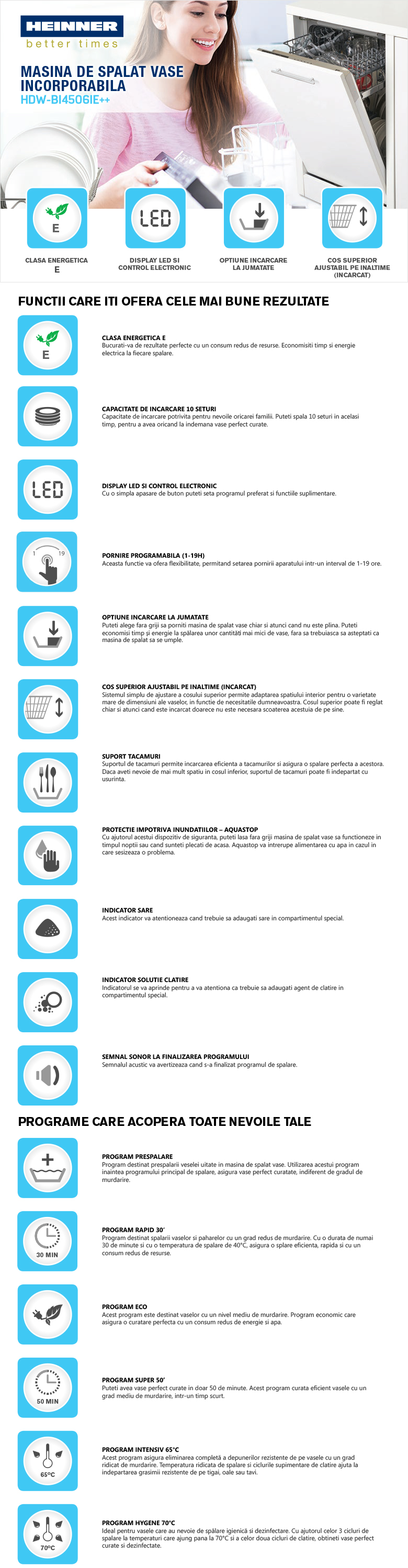 Masina de spalat vase incorporabila Heinner HDW-BI4506IE++, 10 seturi, clasa energetica E, control electronic, display LED, 6 programe de spalare, program rapid 30’, program Hygiene 70°C, program Prespalare, program ECO, optiune incarcare la jumatate, pornire programabila (1- 19H), cos superior ajustabil pe inaltime (incarcat), protectie impotriva inundatiilor - Aquastop, consum apa: 11L/ciclu de spalare, semnal sonor finalizare program, dimensiuni (IxLxA): 82 x 44.8 x 55 cm