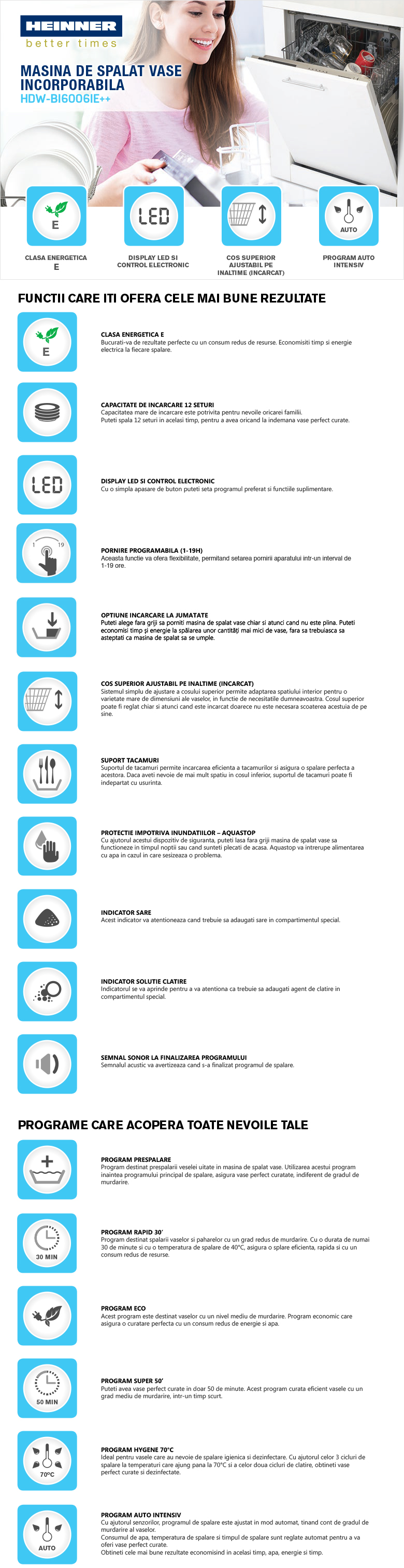 Masina de spalat vase incorporabila Heinner HDW-BI6006IE++, 12 seturi, clasa energetica E, control electronic, display LED, 6 programe de spalare, program rapid 30’, program Hygiene 70°C, program Auto Intensiv, pornire programabila (1-19H), optiune incarcare la jumatate, cos superior ajustabil pe inaltime (incarcat), protectie impotriva inundatiilor – Aquastop, semnal sonor finalizare program, consum apa: 12L/ciclu de spalare, dimensiuni: 82 x 59.8 x 55 cm