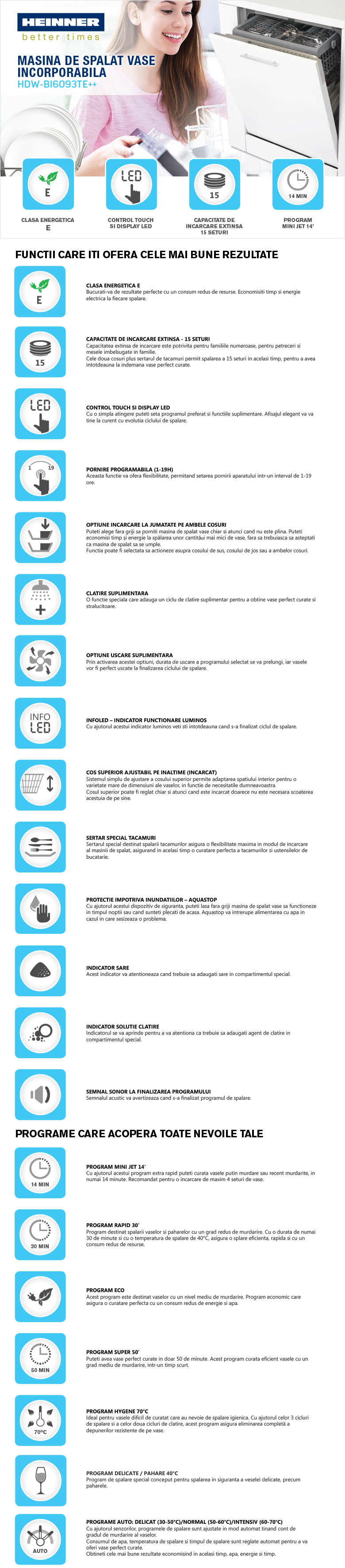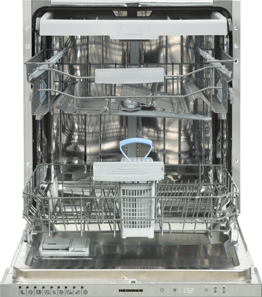 Masina de spalat vase Heinner incorporabila HDW-BI6093TE++, 15 seturi, clasa energetica E, control touch, display LED, 9 programe de spalare, program Mini Jet 14’, program rapid 30’, program Hygiene 70°C, program Delicate 40°C, programe Auto: Delicat/Normal/Intensiv, optiune incarcare la jumatate pe ambele cosuri, pornire programabila (1-19H), clatire suplimentara, uscare suplimentara, cos superior ajustabil pe inaltime (incarcat), 3 Cosuri – cos superior tacamuri, InfoLED – Indicator functionare luminos pe pardoseala, indicator acustic final program, protectie impotriva inundatiilor – Aquastop, consum apa: 9L/ciclu de spalare, dimensiuni: 82-87 x 59.8 x 55 cm