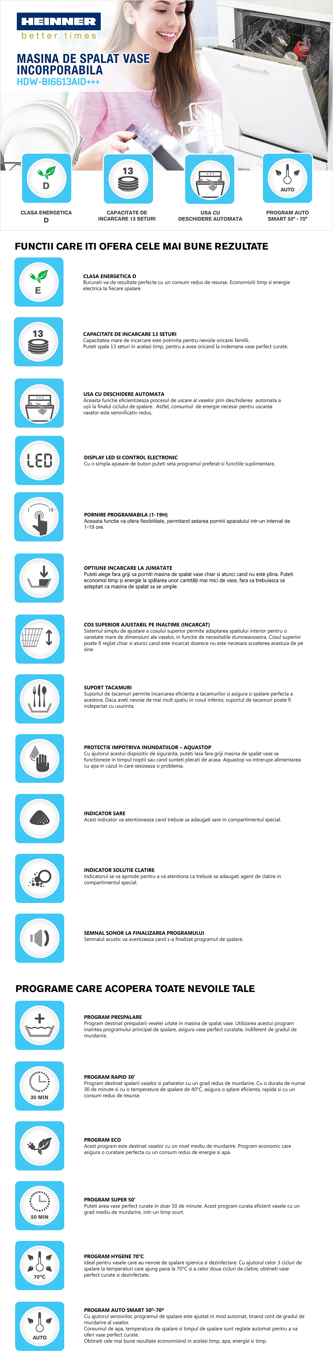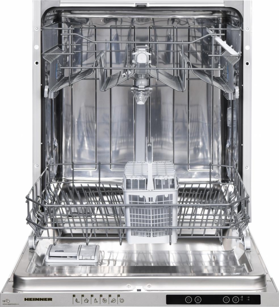 Masina de spalat vase incorporabila Heinner HDW-BI6613AID+++, clasa energetica D, 13 seturi, control electronic, display LED, 6 programe de spalare, program Rapid 30’, program Hygiene 70°C, program Auto Intensiv, pornire programabila (1-19H), optiune incarcare la jumatate, cos superior ajustabil pe inaltime (incarcat), protectie impotriva inundatiilor – Aquastop, semnal sonor finalizare program, sistem deschidere automata usa, consum apa: 12L/ciclu de spalare, dimensiuni (WxDxH): 59.8 x 55 x 82 cm