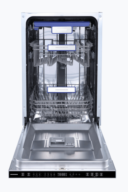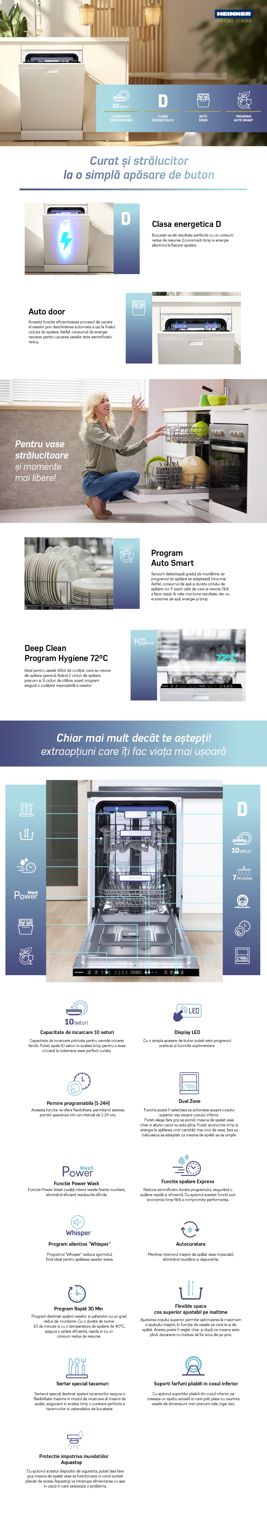 Masina de spalat vase incorporabila Heinner HDW-BIM45710AD+++, 10 seturi, clasa energetica D, display LED, deschidere automata a usii la finalizarea programului, 7 programe de spalare, program Auto Smart: 55°C - 65°C, Deep Clean - program Hygiene 72°C, program silentios "Whisper", program Autocuratare, program Rapid 30’, pornire programabila (1-24H), optiune incarcare la jumatate pe ambele cosuri - Dual zone, functie spalare intensa – Power Wash, functie spalare Express, 3 cosuri – cos superior tacamuri, Flexible space - cos superior ajustabil pe inaltime (incarcat), cos inferior: 2 suporti farfurii pliabili, protectie impotriva inundatiilor – Aquastop, consum apa: 8.5L/ciclu de spalare, dimensiuni (LxAxI): 45 x 55 x 82 cm