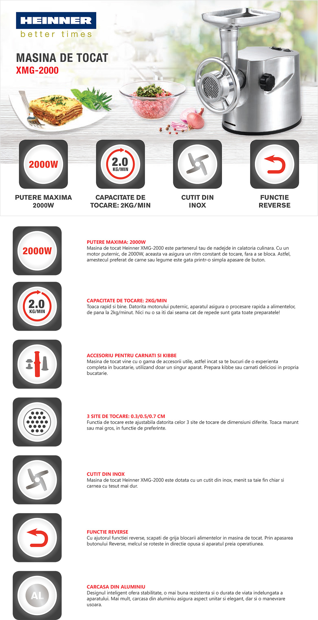 Masina de tocat carne Heinner PowerMix 2000 XMG-2000, capacitate de tocare: 2kg/min, marime cap tocare: #8, functie reverse, accesoriu pentru carnati, accesoriu pentru kibbe, cutit din inox, 3 site de tocare metalice, carcasa din aluminiu, putere maxima: 2000W, nivel de zgomot: