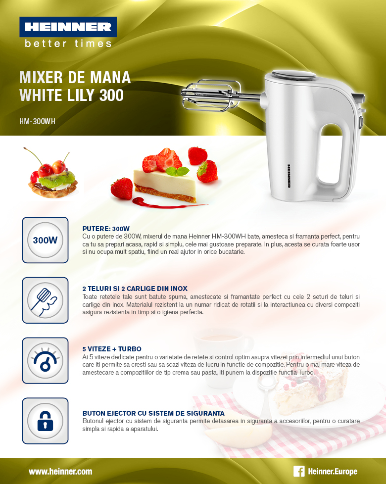 Mixer de mana Heinner White Lily 300 HM-300WH, putere: 300W, teluri si carlige din inox, 5 viteze + Turbo, buton ejector cu sistem de siguranta, ornamente din inox, nivel de zgomot: 85dB