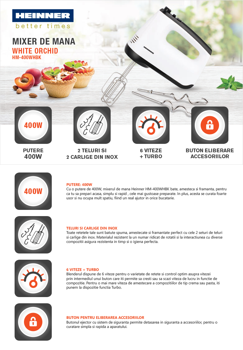 Mixer de mana Heinner HM-400WHBK, 2 teluri din inox si carlige pentru framantat, 6 viteze + functie Turbo, buton pentru detasarea accesoriilor, baza permite depozitarea in pozitie verticala, putere: 400W