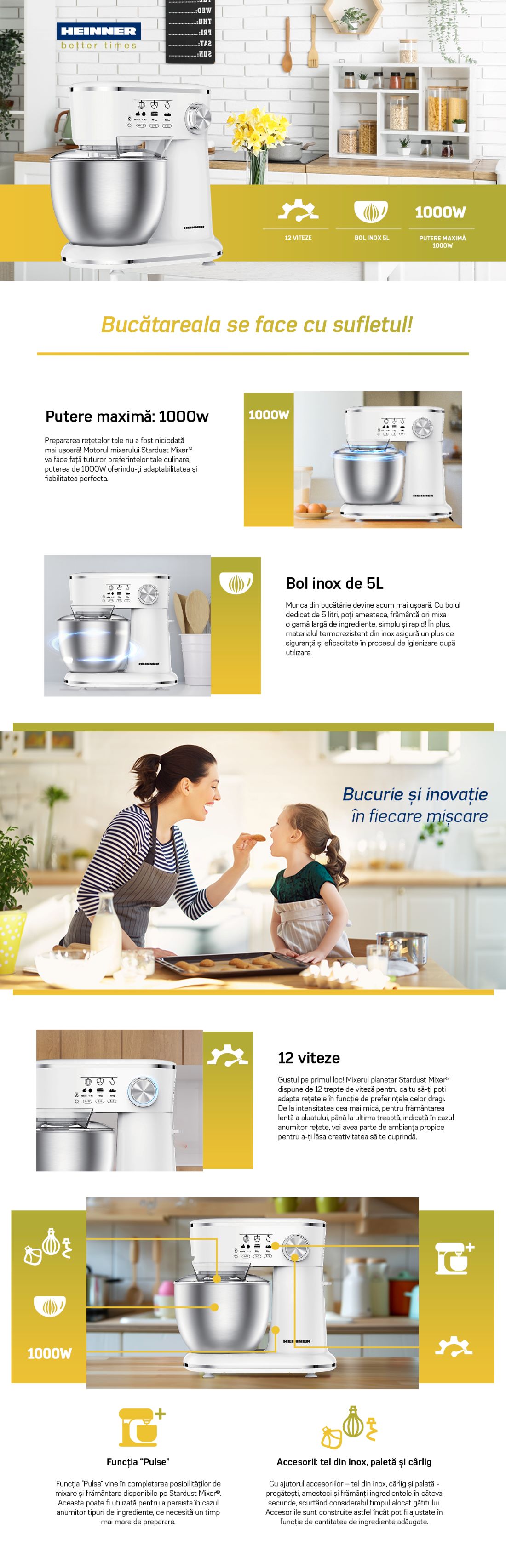 MIXER PLANETAR HEINNER HPM-1000WHCH, 1000W, BOL INOX: 5L, 10 VITEZE, ACCESORII: TEL, CARLI