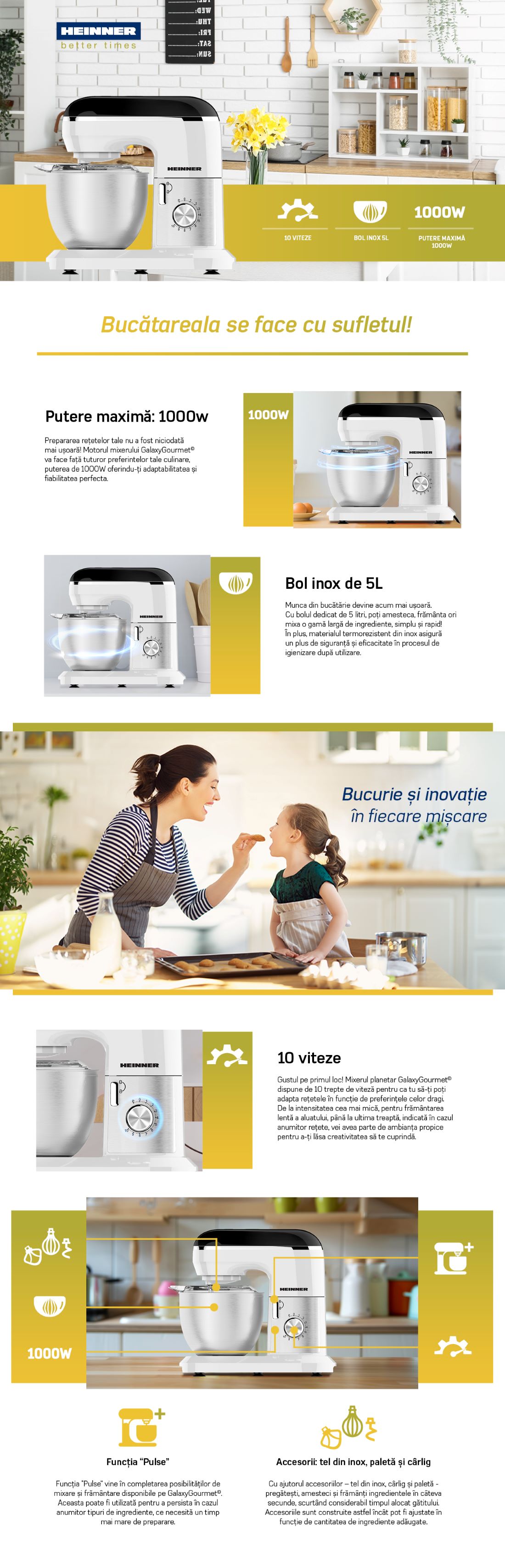 MIXER PLANETAR HEINNER HPM-1300WHBK, 1000W, BOL INOX: 5L, 10 VITEZE + PULSE, ACCESORII: TE