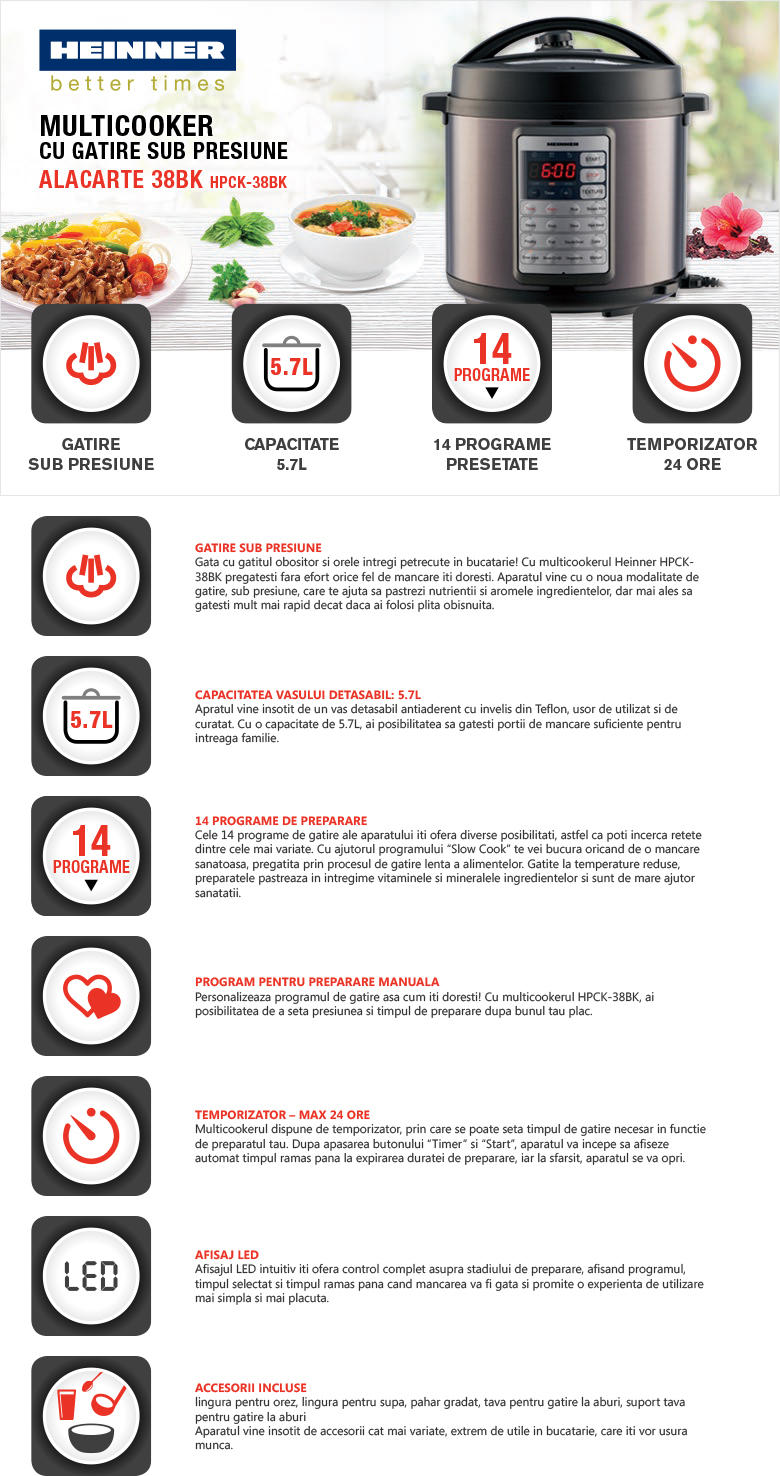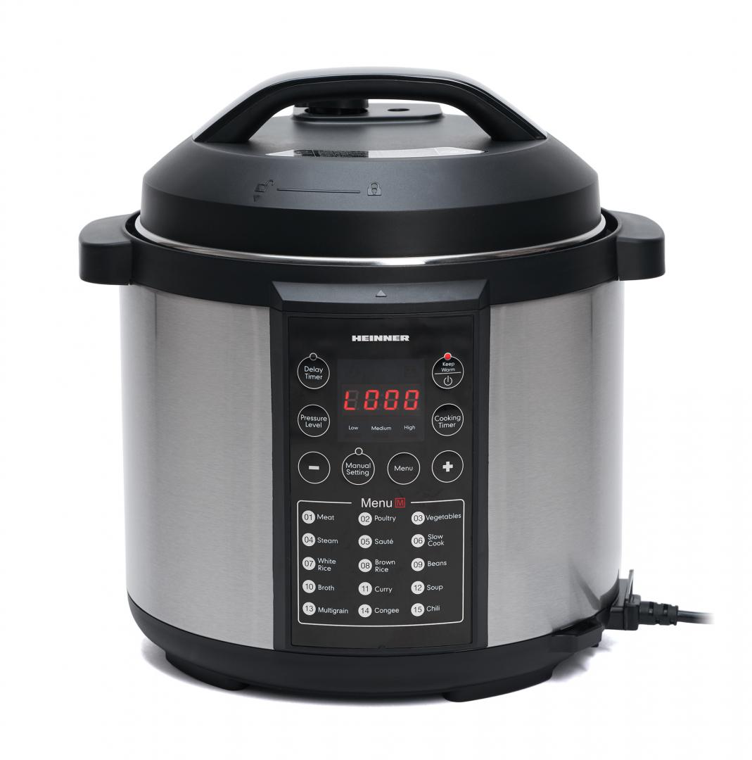 Multicooker cu gatire la presiune Heinner HPCK-38BK, capacitate maxima: 5.7L, capacitate neta de gatire: 3.8L, vas antiaderent detasabil, 14 programe presetate, timp de gatire ajustabil, temporizator 24 ore, sistem de siguranta, afisaj LED, putere: 1000W, inox cu finisaj negru