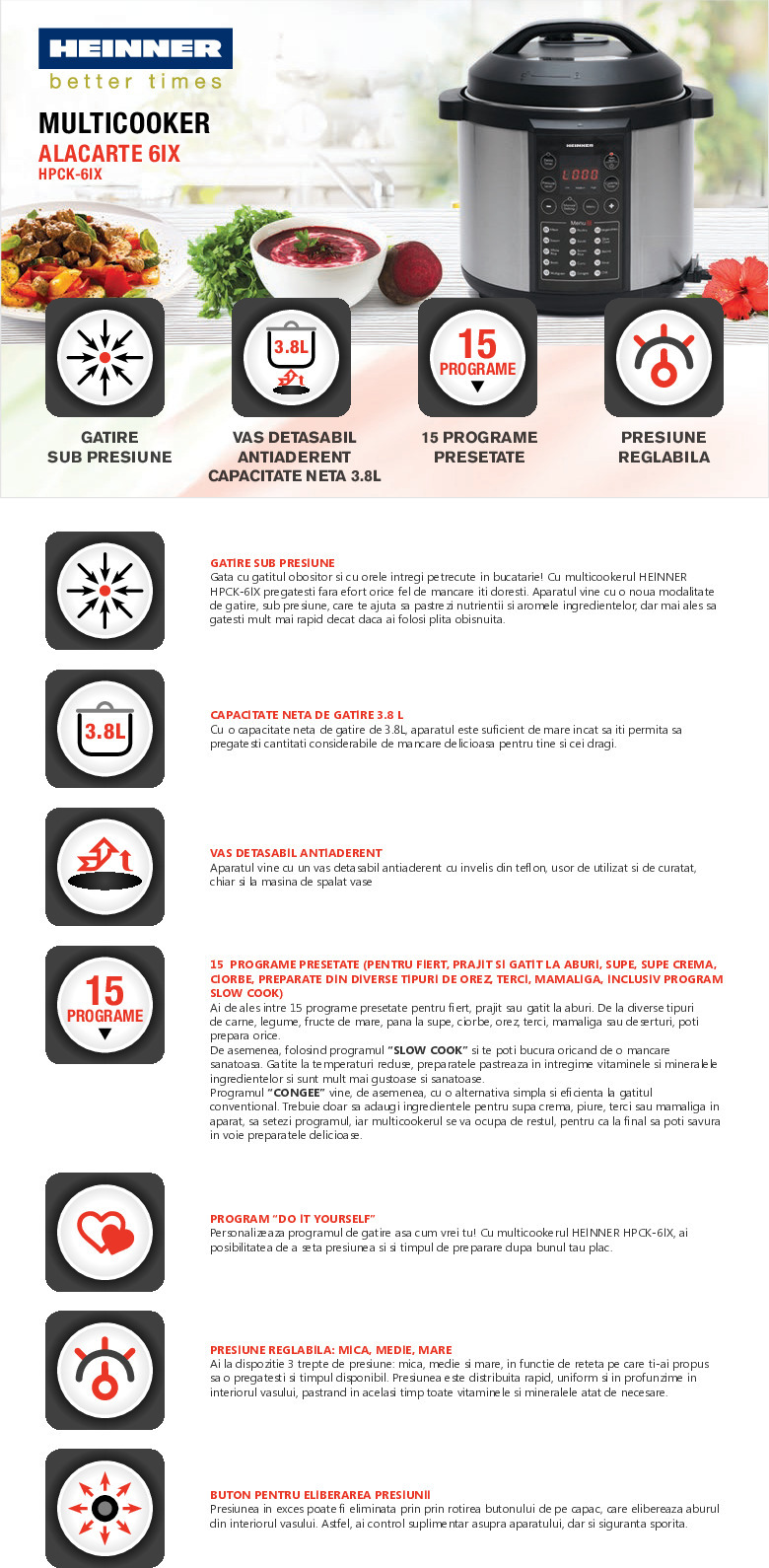 Multicooker cu gatire la presiune Heinner HPCK-6IX, capacitate maxima: 5.7L, capacitate neta de gatire:3.8L, vas antiaderent detasabil, 15 programe presetate, timer - 24 ore, sistem de siguranta, display LED, buton pentru eliminarea presiunii, putere: 1000W, inox