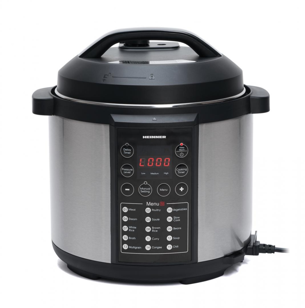 Multicooker cu gatire la presiune Heinner HPCK-6IX, capacitate maxima: 5.7L, capacitate neta de gatire:3.8L, vas antiaderent detasabil, 15 programe presetate, timer - 24 ore, sistem de siguranta, display LED, buton pentru eliminarea presiunii, putere: 1000W, inox