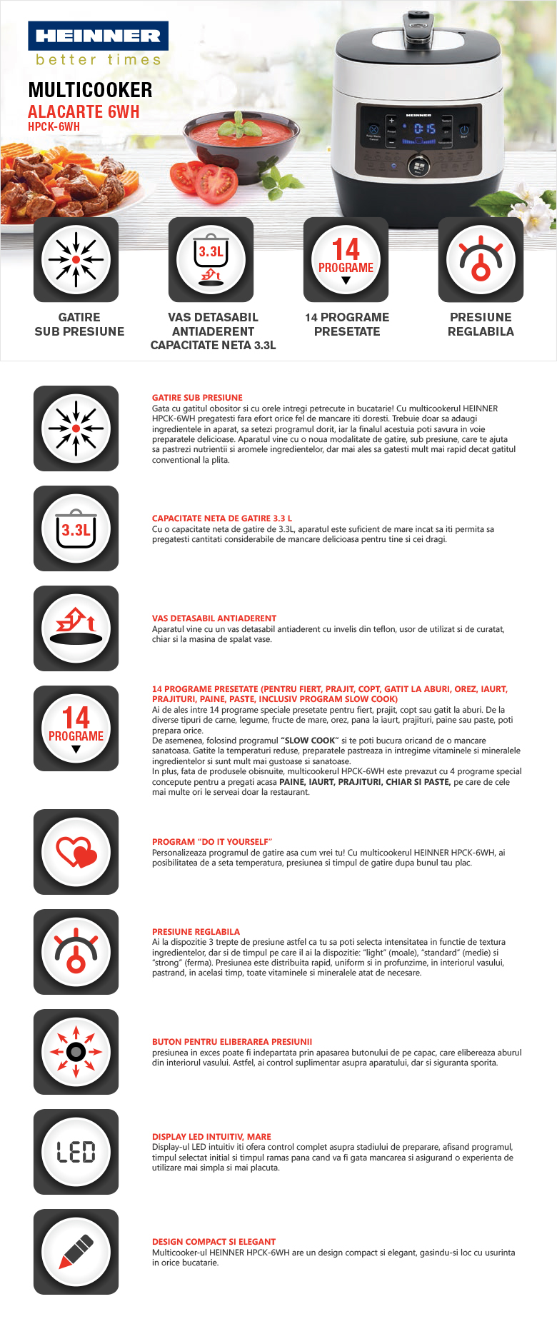 Multicooker cu gatire la presiune Heinner HPCK-6WH, capacitate maxima: 5.5L, capacitate neta de gatire: 3.3L, vas antiaderent detasabil, 14 programe presetate, timer - max 24 ore, sistem de siguranta, display LED mare, buton pentru eliminarea presiunii, functie setare presiune, putere: 1000W, alb