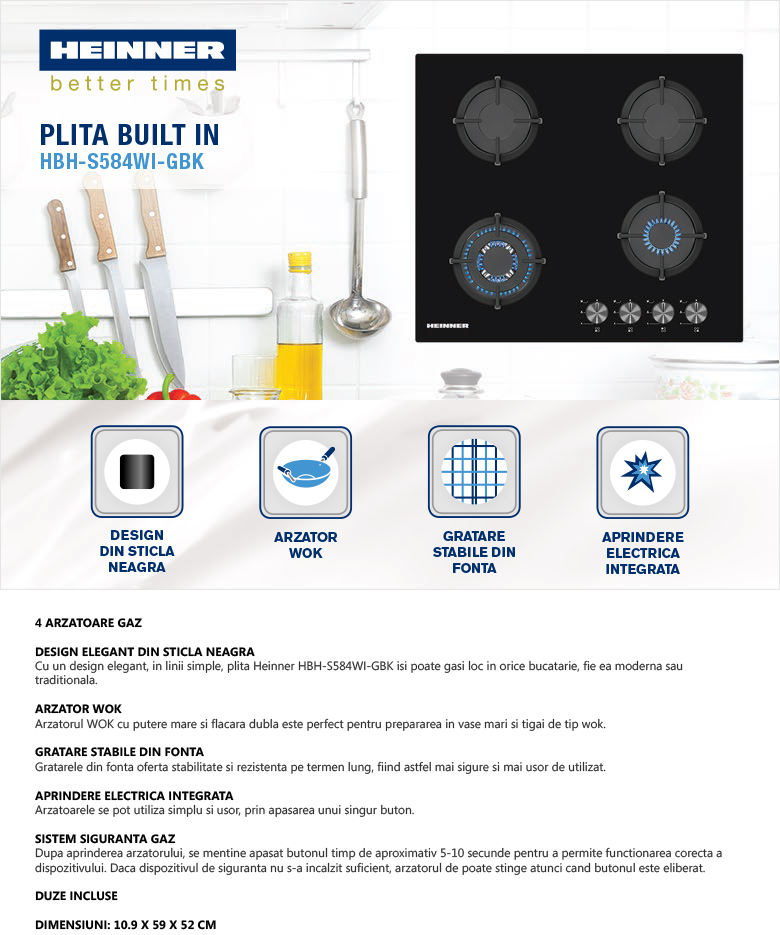 Plita incorporabila Heinner HBH-S584WI-GBK, Gaz, 4 arzatoare, Wok, Gratar fonta, Control frontal, Arindere electrica, Dispozitiv de siguranta, Duze GPL incluse, Dimenziuni (LxA): 59x52 cm, Culoare: Sticla Neagra