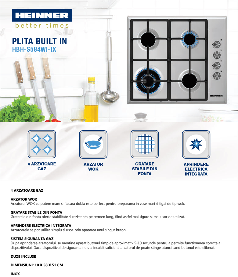 Plita incorporabila Heinner HBH-S584WI-IX, Gaz, 4 arzatoare, Wok, Gratar fonta, Control la