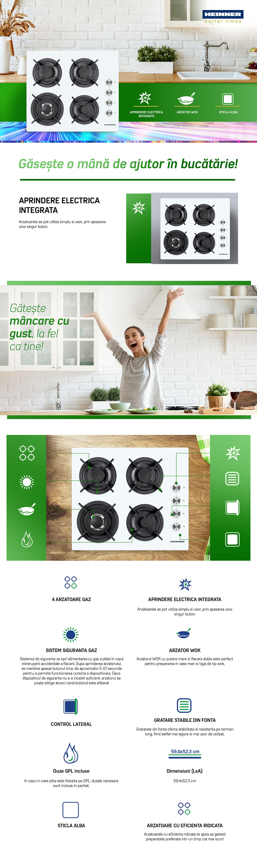 PLITA INCORPORABILA HEINNER HBH-V4IWF-GWH, GAZ, 4 ARZATOARE, WOK, GRATAR FONTA, CONTROL LATERAL, ARINDERE ELECTRICA, DISPOZITIV DE SIGURANTA, DUZE GPL INCLUSE, DIMENZIUNI (LXA): 59X52 CM, CULOARE: STICLA ALBA
