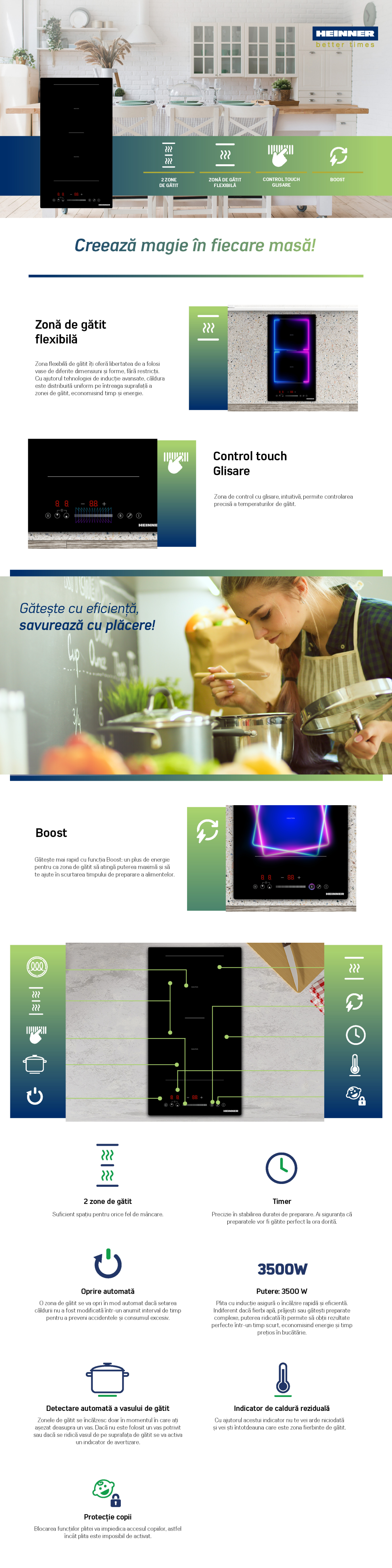 PLITA INCORPORABILA HEINNER HBHI-M2ZB1FXTC, INDUCTIE, 2 ZONE DE GATIT, BOOST 2 ZONE, CONTROL TOUCH-GLISARE, FUNCTIE BRIDGE, TIMER, OPRIRE AUTOMATA, PROTECTIE COPII, DETECTARE AUTOMATA A VASULUI DE GATIT, INDICATOR DE CALDURA REZIDUALA, PUTERE: 3500W, DIMENSIUNI (LXA): 28.8X52 CM, CULOARE: STICLA NEAGRA