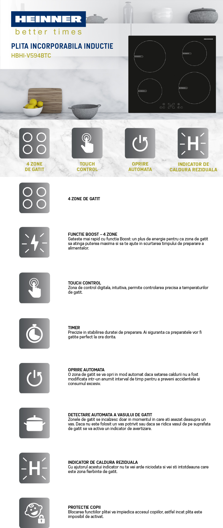 Plita incorporabila Heinner HBHI-V594BTC, Inductie, 4 zone de gatit, Boost 4 zone, Control touch, Timer, Oprire automata, Protectie copii, Detectare automata a vasului de gatit, Indicator de caldura reziduala, Putere: 7400W, Dimensiuni (LxA): 59x52 cm, Culoare: Sticla Neagra