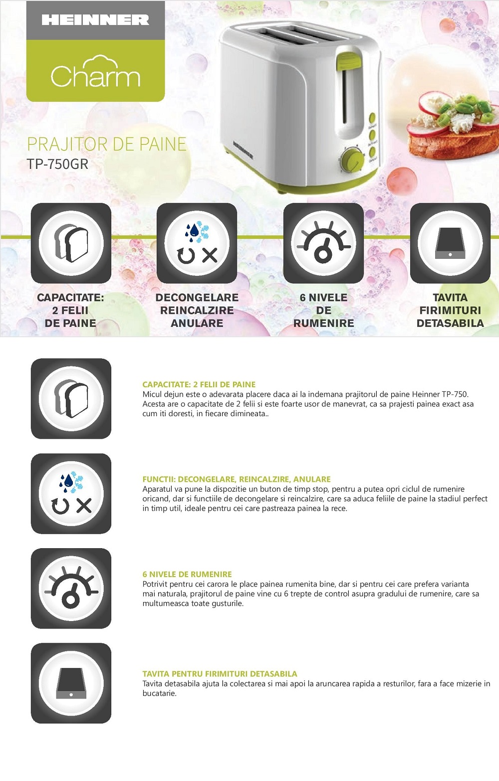 Prajitor de paine Heinner Charm 750, TP-750GR, putere: 750W, 6 nivele de rumenire, 3 functii: dezghetare, reincalzire si oprire, control variabil al temperaturii, functie intrerupere ciclu prajire, functie oprire automata, functie ridicare felii paine, tavita firimituri detasabila, culoare: verde