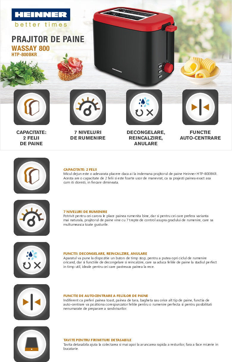 Capacitate: 2 felii, functii: decongelare, reincalzire si anulare, 7 niveluri de rumenire, functie de autocentrare a feliilor de paine, tavite detasabile pentru firimituri, putere: 800W