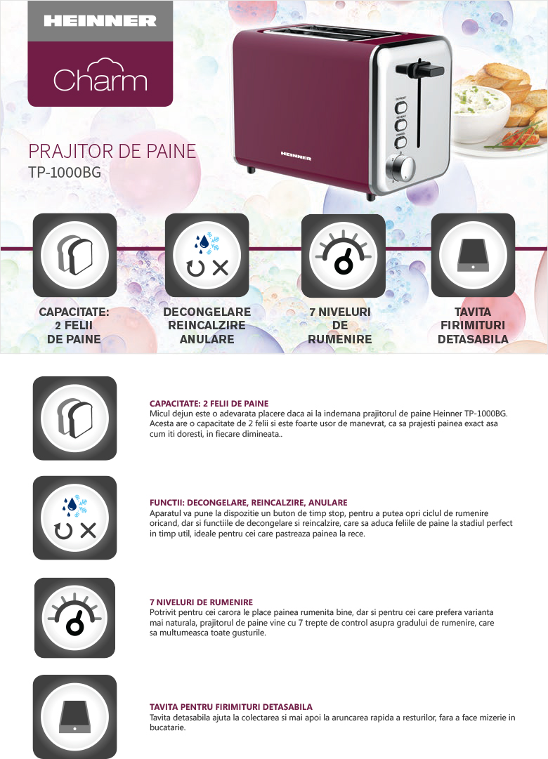 Prajitor de paine Heinner TP-1000BG,putere: 715-850W, capacitate: doua felii, 7 niveluri de rumenire, 3 functii: dezghetare, oprire, reincalzire, tavita de firimituri detasabila, spatiu depozitare cablu de alimentare, material: inox, culoare: visiniu.